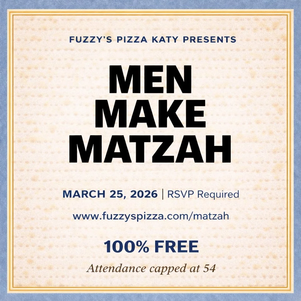 Join us at Fuzzy’s Pizza Katy for a casual night where you’ll build your own matzah, hang out, and get into the holiday spirit (or just come for matzo goodness).